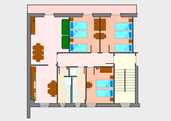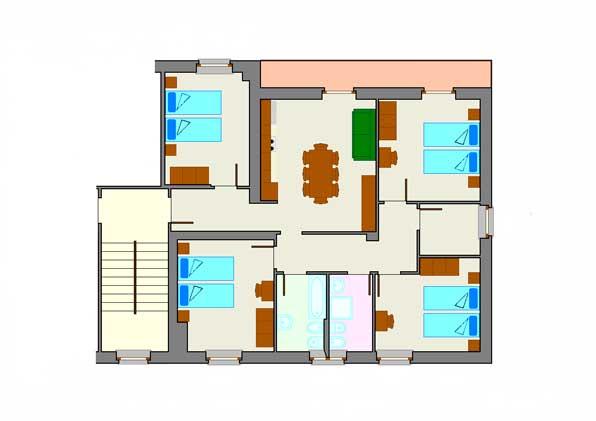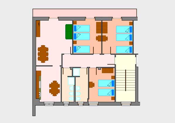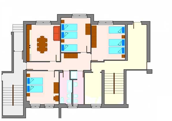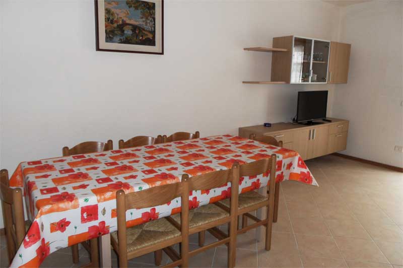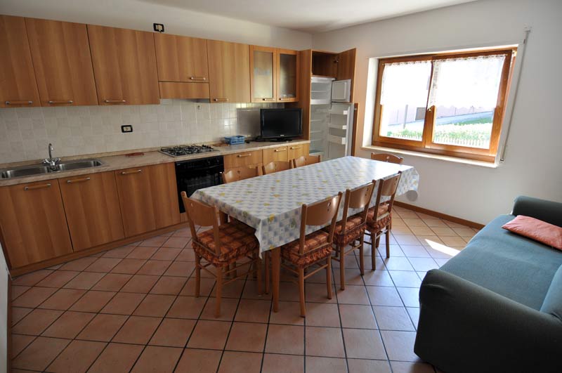 Apartment of 100 square meters (6/8 beds) located on the ground floor consists of: three bedrooms, large living room with kitchenette, two bathrooms (one bathroom with shower one with bath).